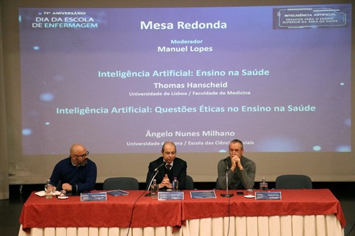 A mesa-redonda dedicada ao tema “Inteligência Artificial no Ensino da Saúde” teve a participação do antigo diretor da escola, Manuel Lopes, docente do Departamento de Enfermagem. A sessão integrou duas conferências, proferidas por Thomas Hanscheid, da Faculdade de Medicina da Universidade de Lisboa, e por Ângelo Nunes Milhano, docente do Departamento de Filosofia da Universidade de Évora, centradas respetivamente nas potencialidades da inteligência artificial no ensino da saúde e nas questões éticas associadas à sua utilização.